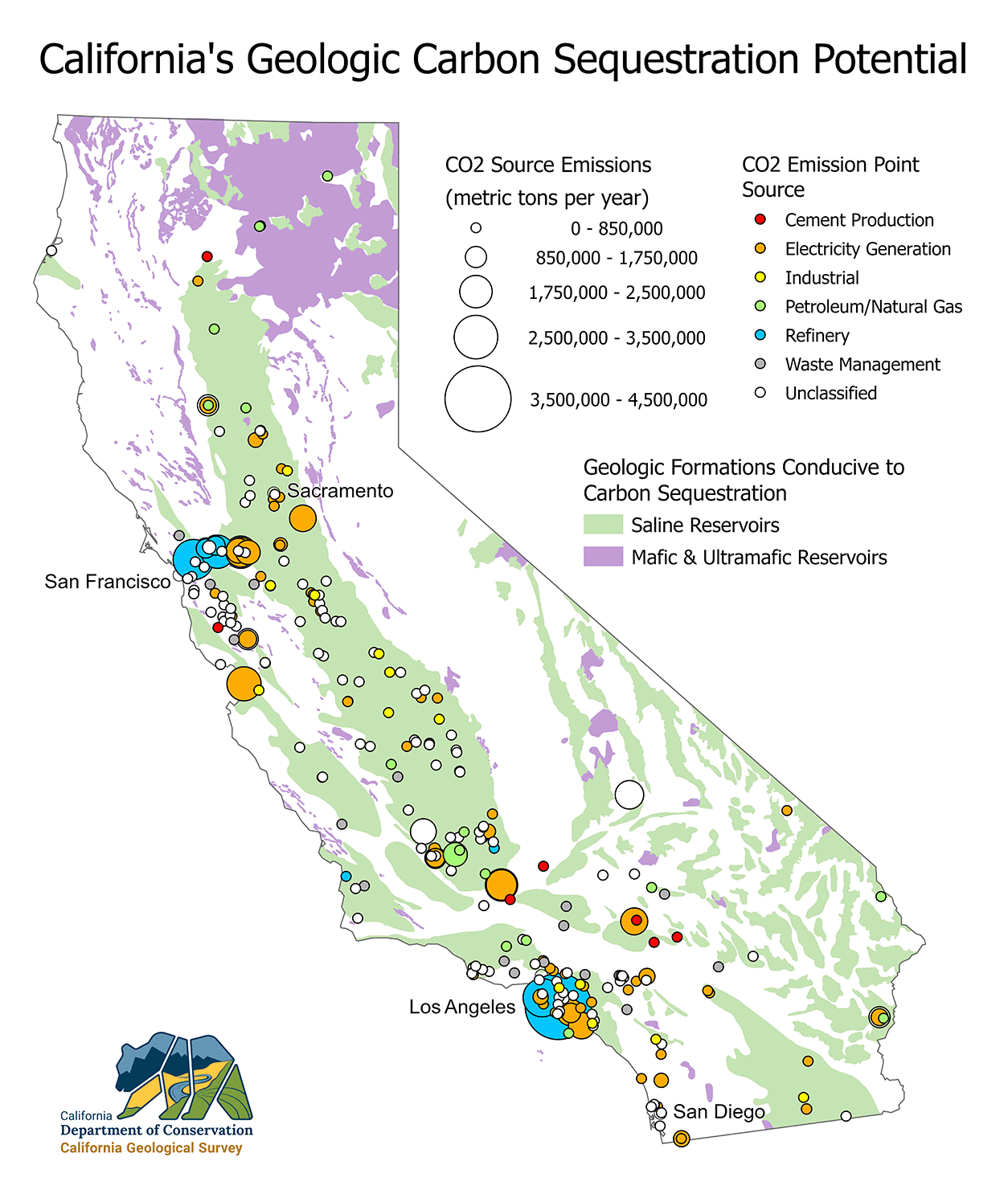 Figure 2. California has several types of geologic formations conducive to carbon sequestration. Saline, mafic, and ultramafic reservoirs have been identified in many parts of the state. The map also shows sources of carbon dioxide emissions which are most abundant in the Los Angeles area, the San Francisco Bay area, and the Central Valley. Click the image to open a larger version in a new window.