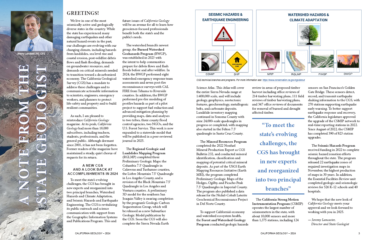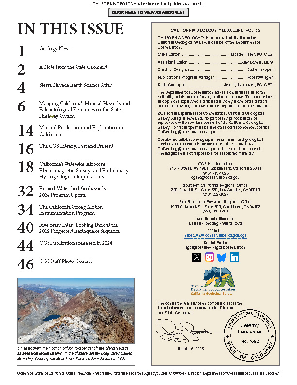 After a long hiatus—23 years—CALIFORNIA GEOLOGY™ magazine is back by popular demand. We know you really liked the original print format, but we couldn't make it happen with this issue; it's only available digitally. However, we designed it to be printed on a personal printer.
