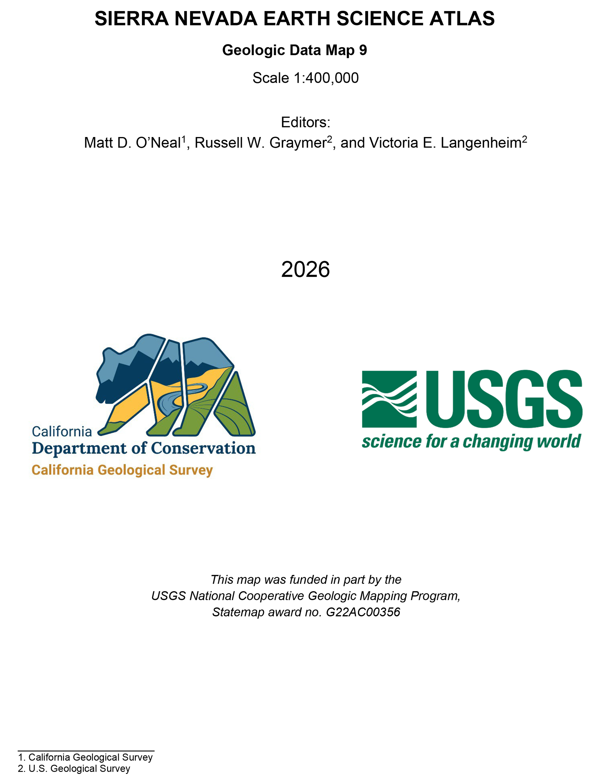 The Sierra Nevada Earth Science Atlas provides the most detailed geologic framework mapping of California’s most iconic landscape to date. This web page hosts the numerous maps, data layers, and an associated report that make up the Atlas. Collectively, these layers and report show and describe the geology of the Sierra Nevada, a prominent mountain range that extends roughly north-south across eastern California and into a small portion of western Nevada, along with adjacent areas. The Atlas is published as Geologic Data Map 9 (GDM 9).