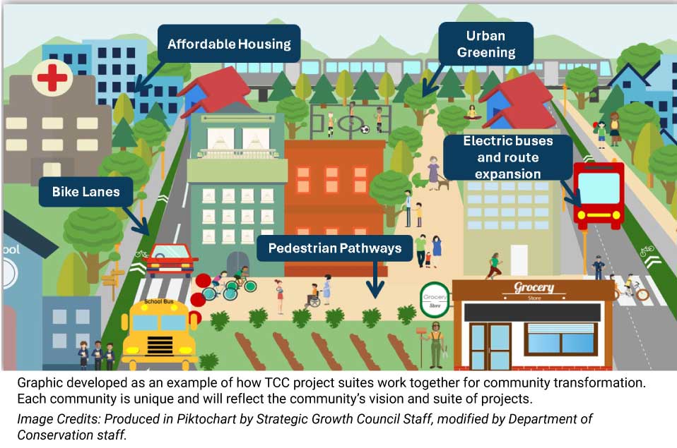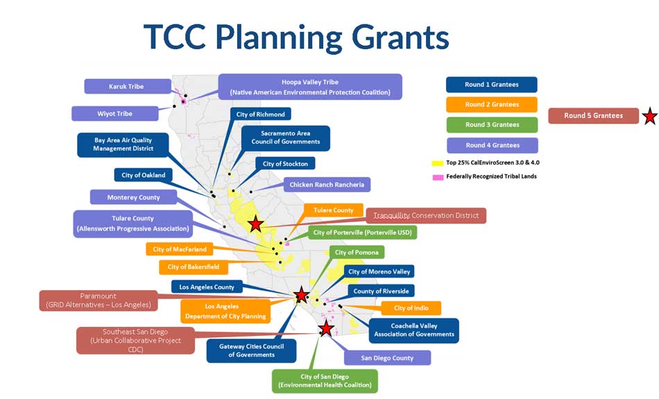 The Transformative Climate Communities (TCC) Program funds community-led development and infrastructure projects that achieve major environmental, health, and economic benefits in California's most disadvantaged communities. TCC empowers the communities most impacted by pollution to choose the strategies and projects best suited to achieve their community vision and enact transformational change. All with data-driven milestones and measurable outcomes.