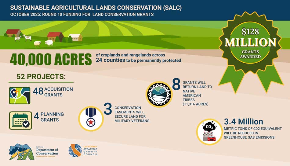 The Department of Conservation works in cooperation with the California Natural Resources Agency (CNRA)​ and the Strategic Growth Council (SGC)​ to implement the Sustainable Agricultural Lands Conservation Program (SALC). SALC supports agricultural land conservation, economic growth, and sustainable development by providing grants for three types of projects: